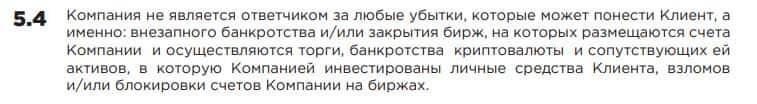 Если вдруг произойдет какой-либо сбой на самой бирже, где якобы размещаются счета компании с которых они торгуют, и все деньги пропадут, либо сольются, то в таком случае афера Траст Капитал Групп не будет нести ответственность за это. И как видите можно списать на такой случай свой косяк в любой момент.