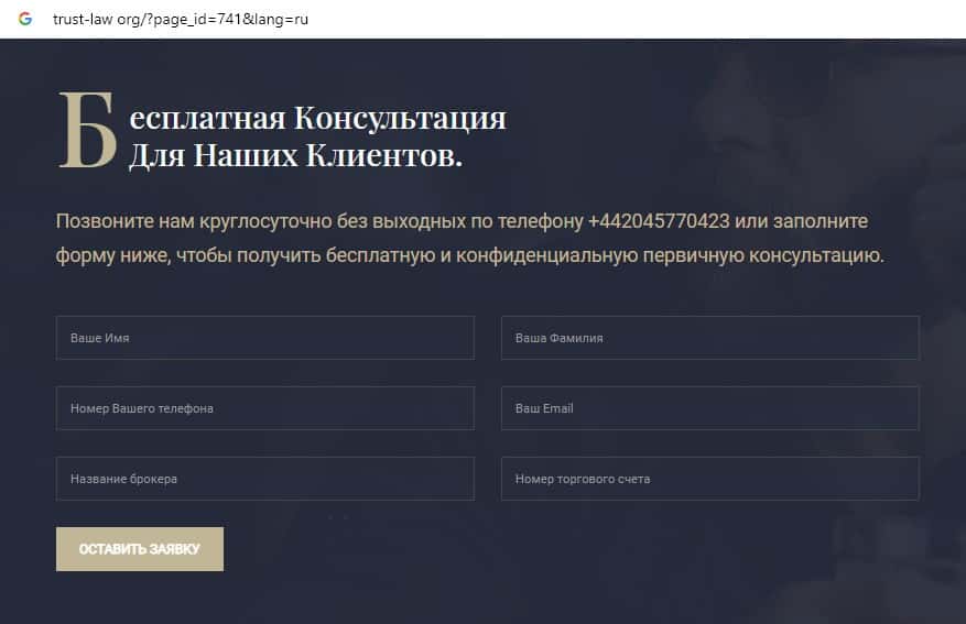 - Клиентское соглашение на сайте шараги Trust Law отсутствует