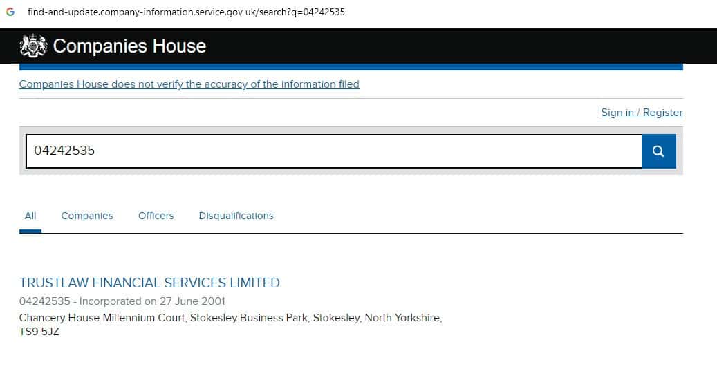 На официальном веб-ресурсе финансового регулятора Великобритании fca org uk информация о лицензии компании Trust Law отсутствует, контора липовая.