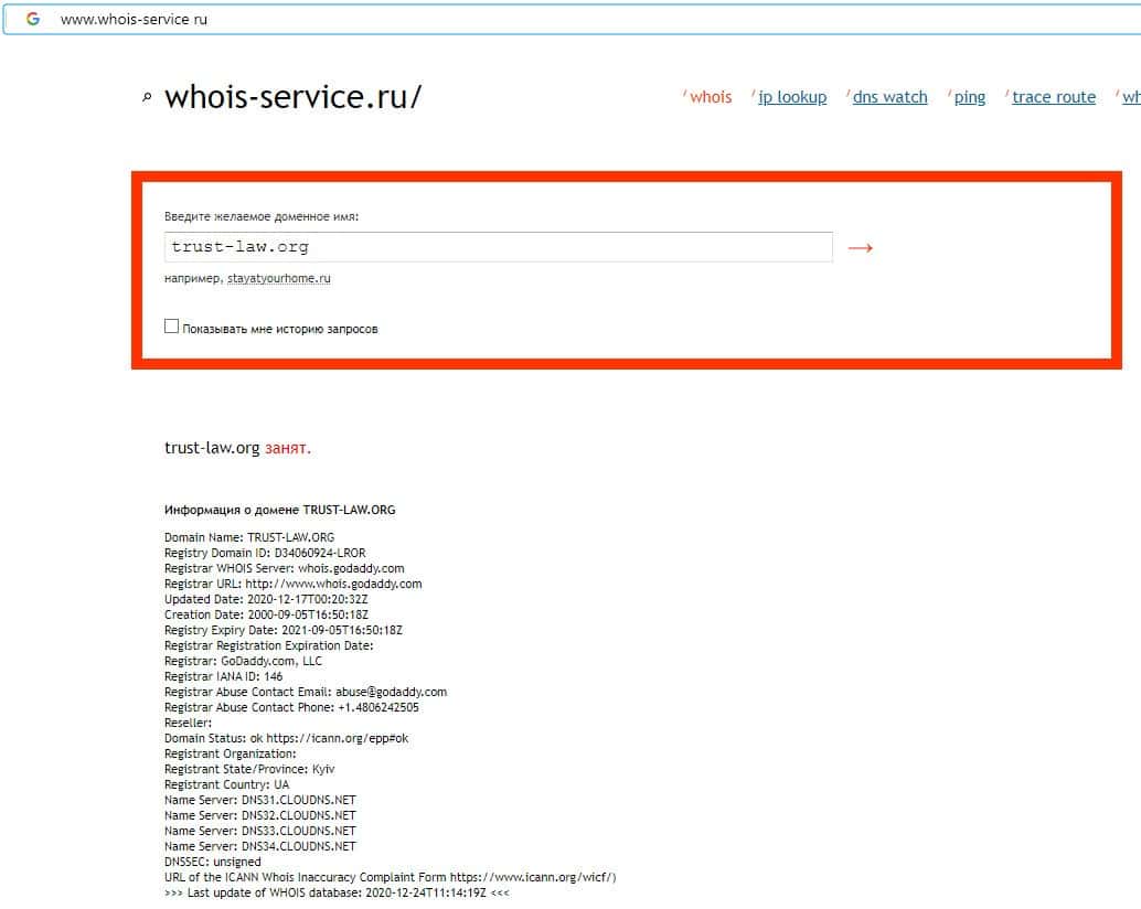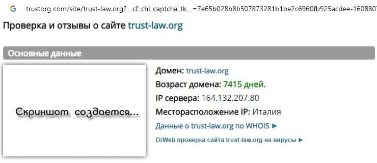 Проведя анализ данных по сайту Trust Law, не было обнаружено информации о владельце домена, что является еще одним признаком того, что имеем дело с лохотроном.