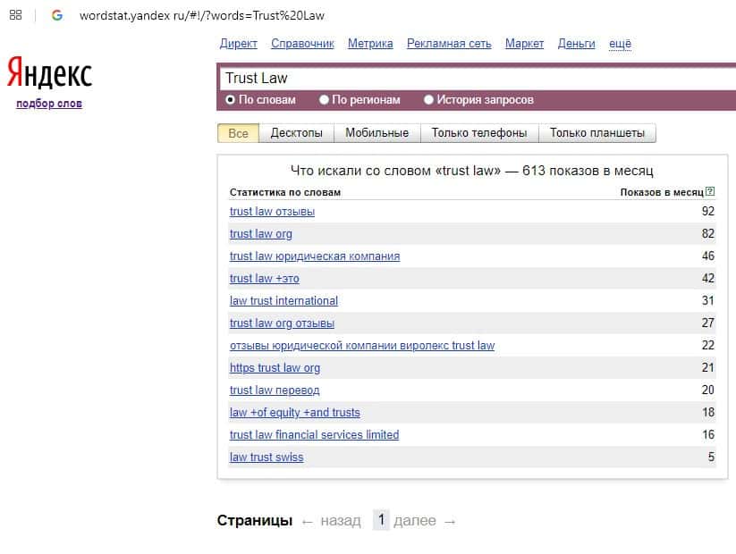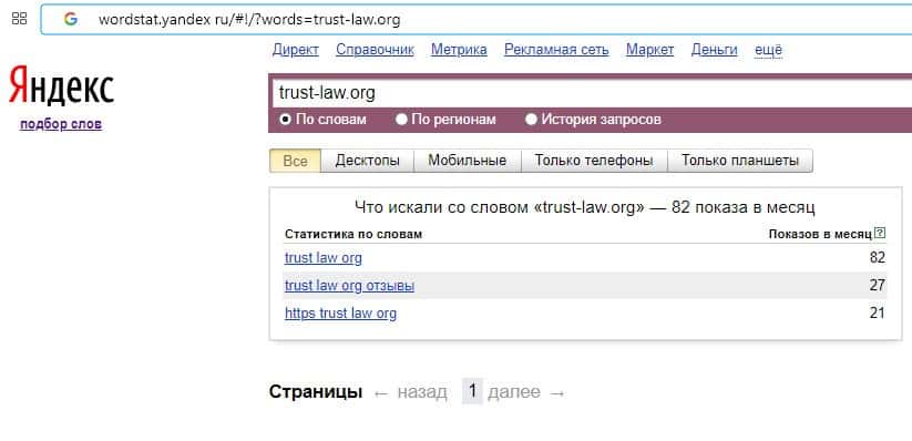 Данный интернет-лохотрон под названием "Trust Law" скорее всего пользуется популярностью на wordstat yandex ru из-за рекламы в интернете.