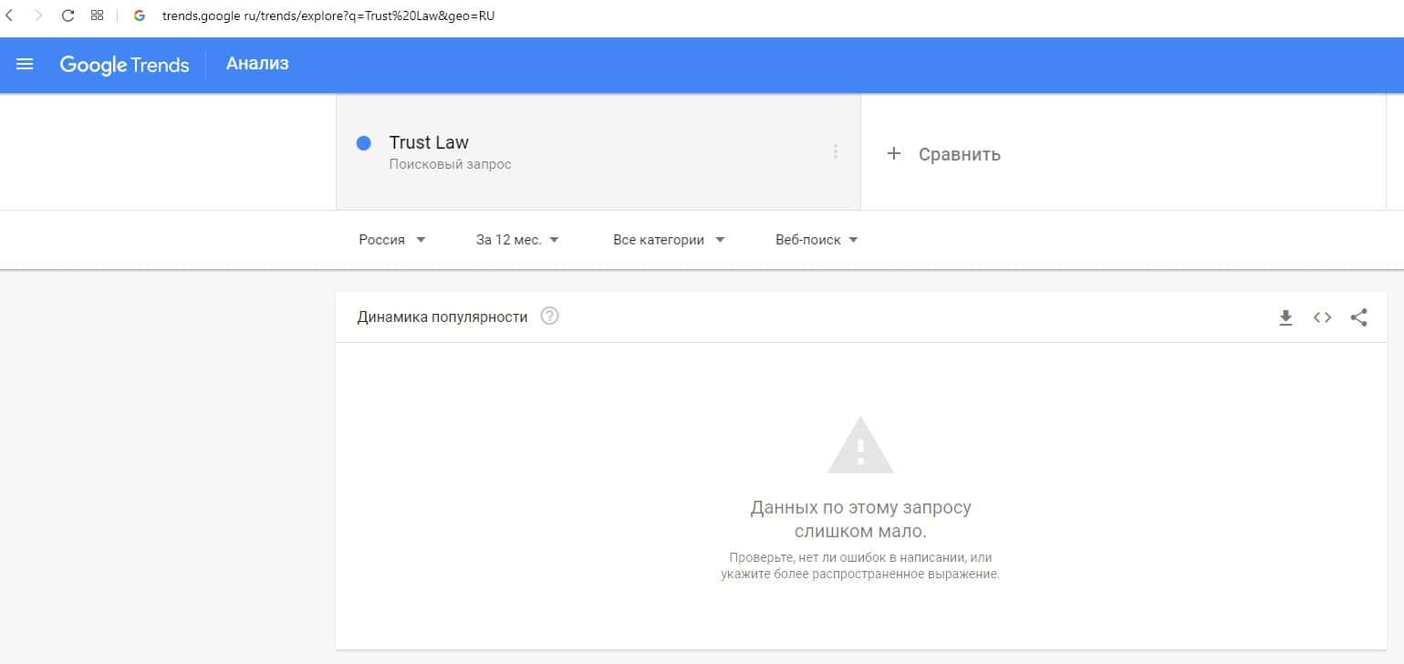О количестве брендовых запросов названия компании на английском языке "Trust Law" на Трендс Гугл Ру информация отсутствует.