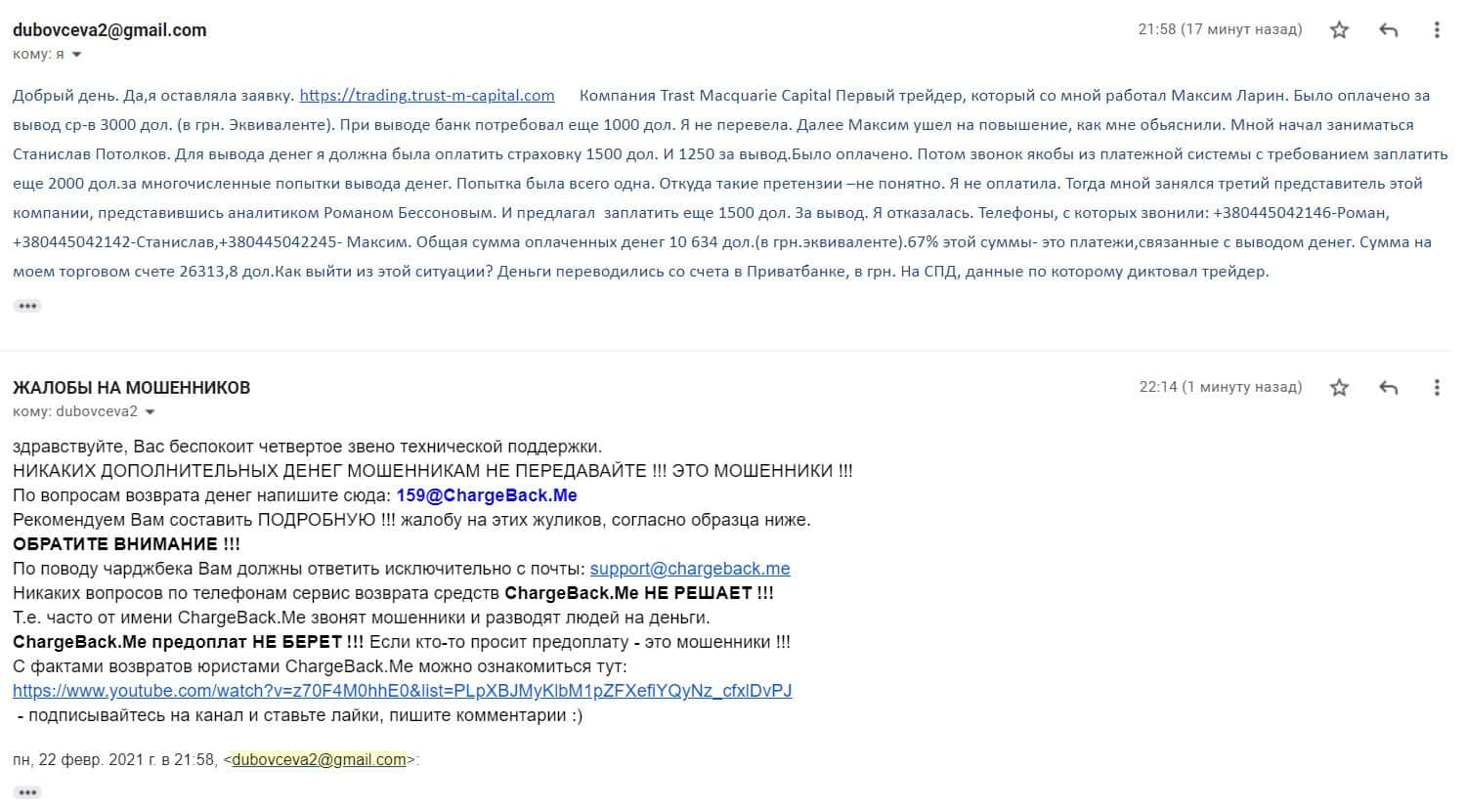 Далее предлагаем ознакомиться с жалобой от одной пострадавшей от деятельности скам-конторы Траст М Капитал, которая развела клиентку на 2500 долларов США.
