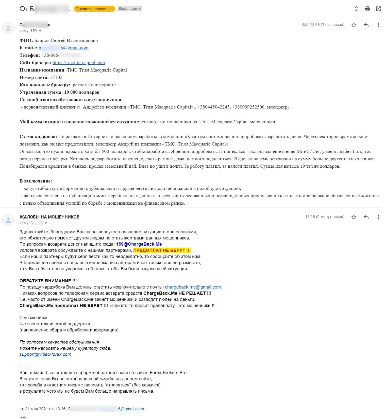 Далее предоставлена жалоба на обманщиков Траст М Капитал, которые работая в одной связке с мошенниками Quantum System кинули клиента на деньги.