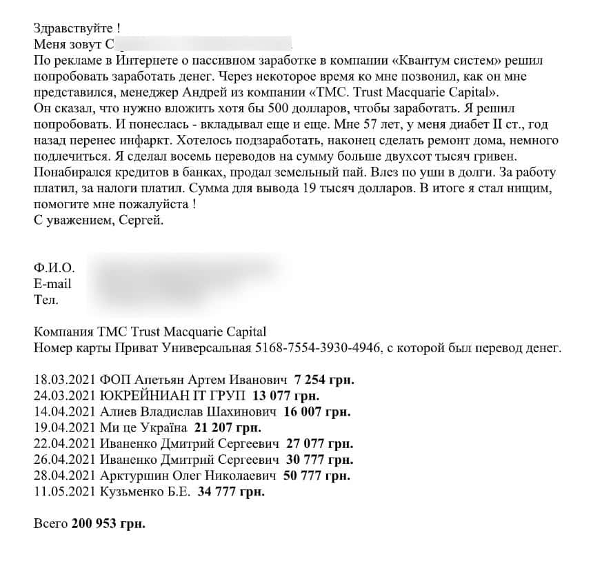 - Аферисты Траст М Капитал и Квантум Систем развели клиента на 119 298 гривен