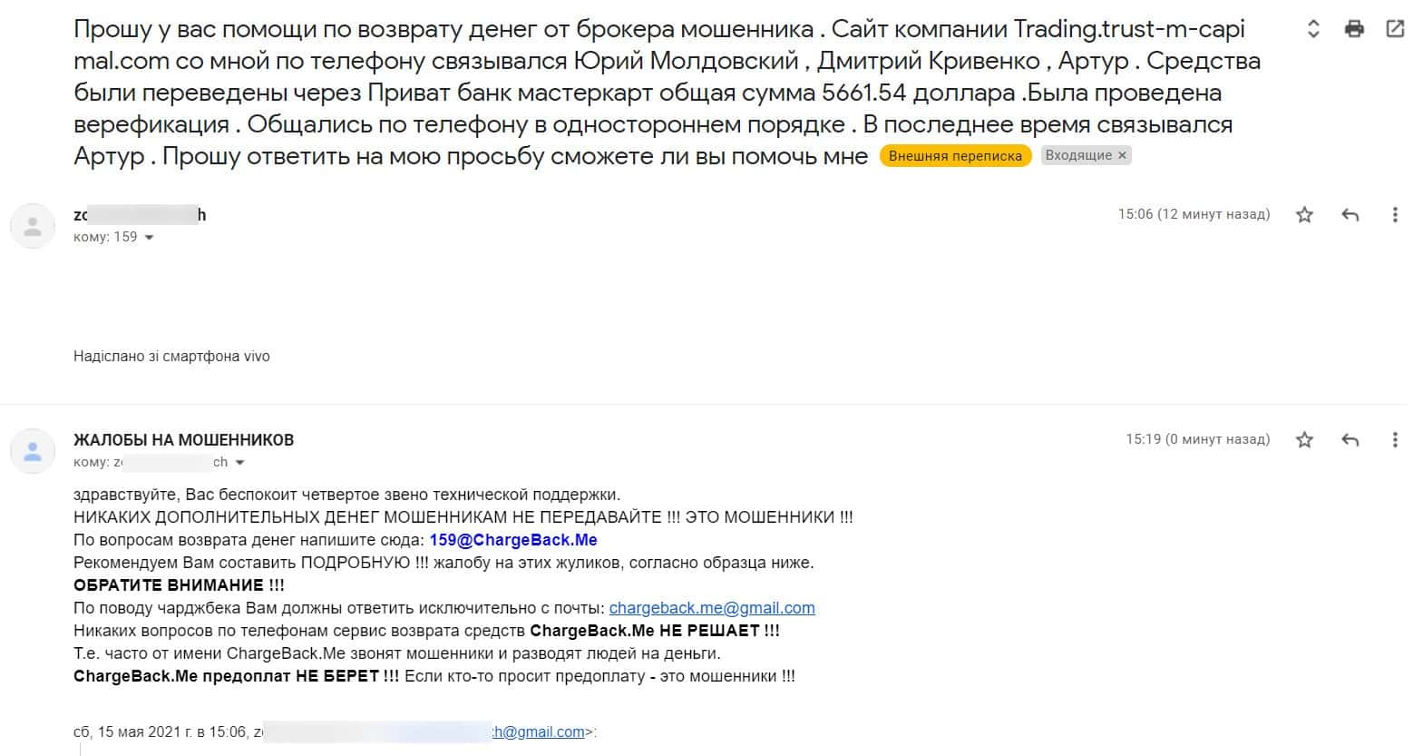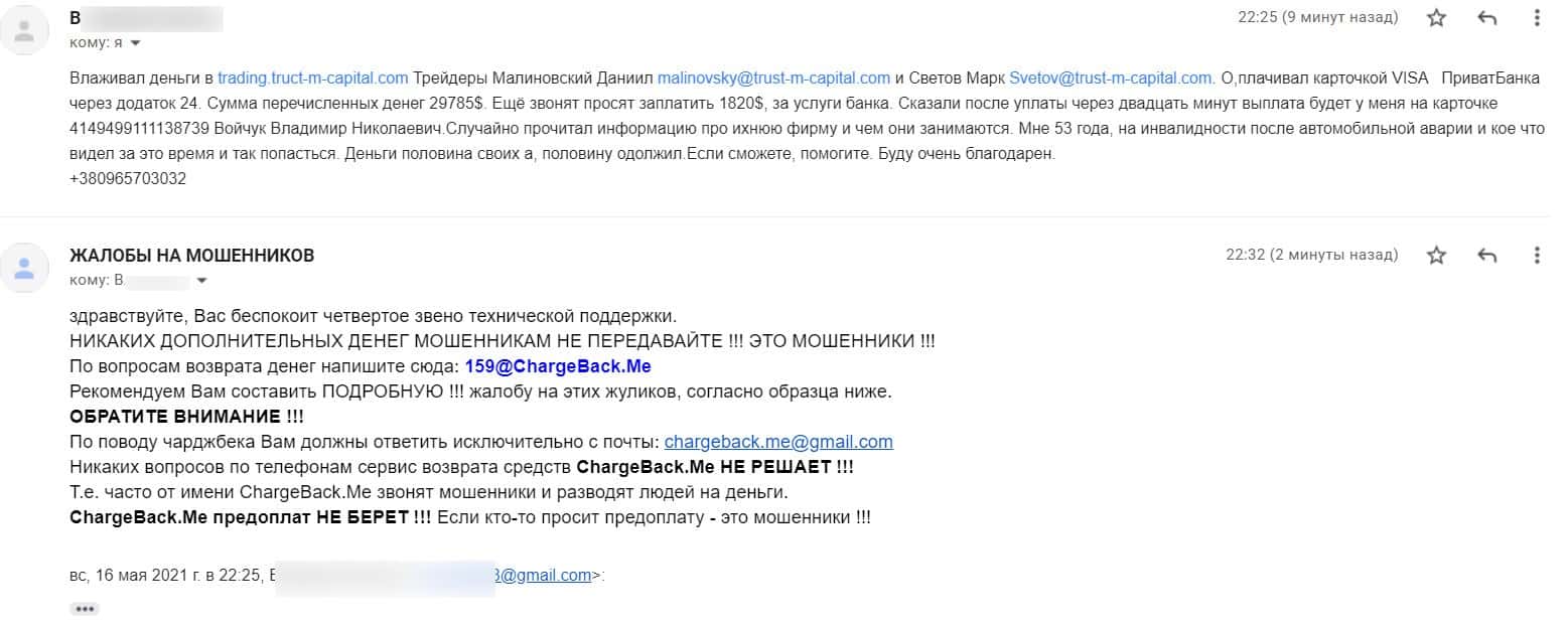 На почтовый адрес сайта по сбору информации о деятельности мошенников Форекс пришла жалоба на аферистов Траст М Капитал, которые кинули клиента на 132 874 гривны.