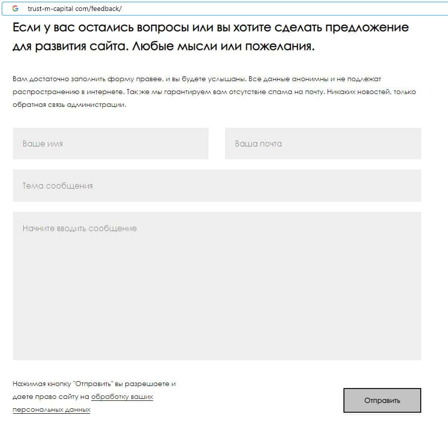 Жулики Trust M Capital ведут сбор данных о посетителях своего дырявого сайта, просят указать свой адрес электронной почты в качестве обратной связи.