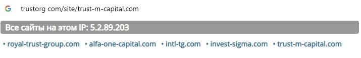 В данном разделе предлагаем ознакомиться с информацией о том, с какими мошенническими организациями находится на одном IP-адресе шарага Траст М Капитал.