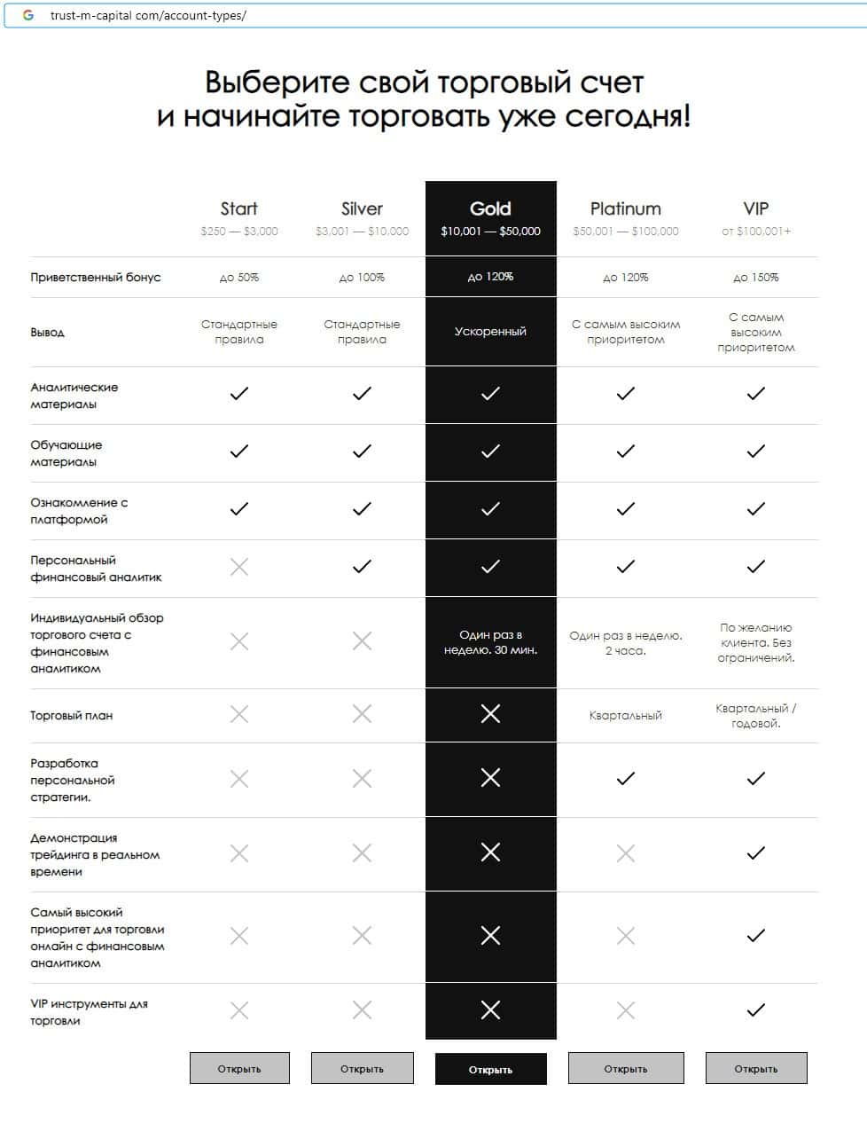Аферисты Trust M Capital предлагают клиентам на выбор 5 типов торгового счета. Реальный Форекс стартует в основном с суммы в 100000 долларов.
