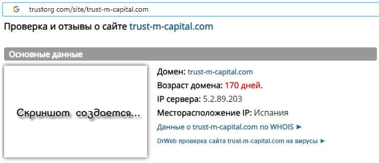 Проверка веб-сайта обманщиков Trust M Capital на trustorg com показала, что возраст домена к моменту написания статьи составляет 170 дней, скорее всего домен купленный.