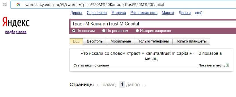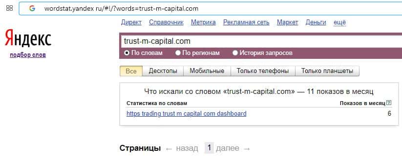Количество запросов по бренду Trust M Capital в поисковике Яндекс