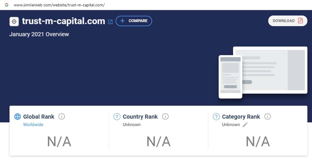При проверке источников бренда по странам компании Траст М Капитал на сайте similarweb com, информация отсутствует, что является признаком фейкового интернет-лохотрона.