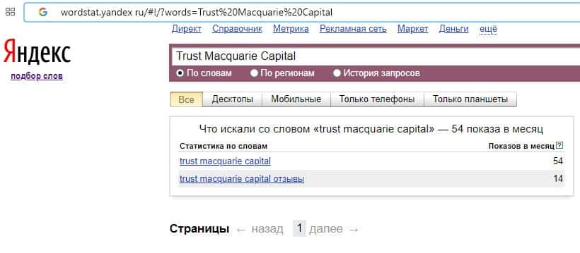 Количество запросов по бренду полного названия компании на английском языке "Trust Macquarie Capital" на wordstat yandex ru составляет 54 запроса за месяц.