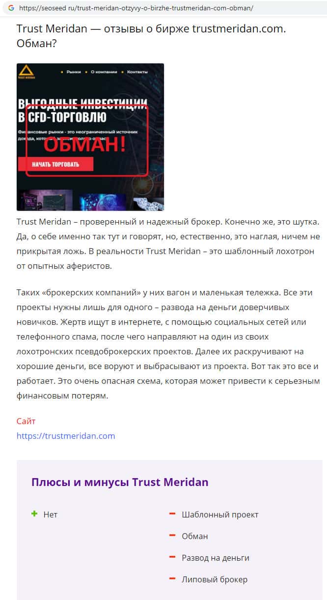 По мнению информационного сайта seoseed ru контора Траст Меридан не единственная во всемирной паутине, подобных мошеннических сайтов в сети очень много.
