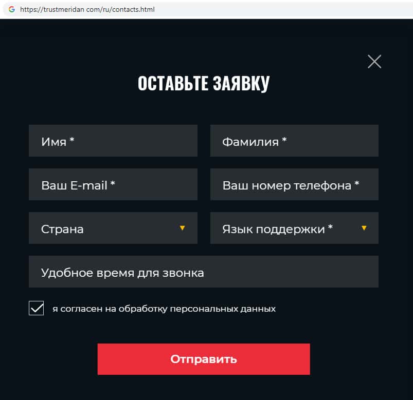 На сайте мошеннической организации Траст Меридан можно запросить обратный звонок, чего делать не рекомендуем, поскольку таким образом аферисты ведут сбор данных.