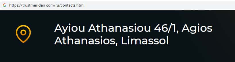 Главный офис скам-организации TrustMeridan находится в оффшоре на Кипре по адресу, который мошенники оставили на своем дырявом сайте: