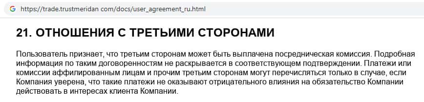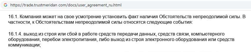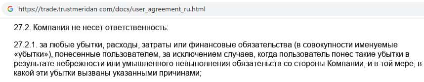 Согласно тому, что аферисты пишут в соглашении, компания TrustMeridan не несет никакой ответственности за не полученную прибыль клиентом, а так же за возможные убытки.