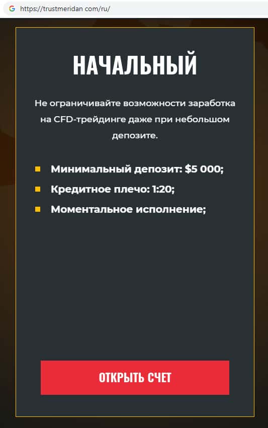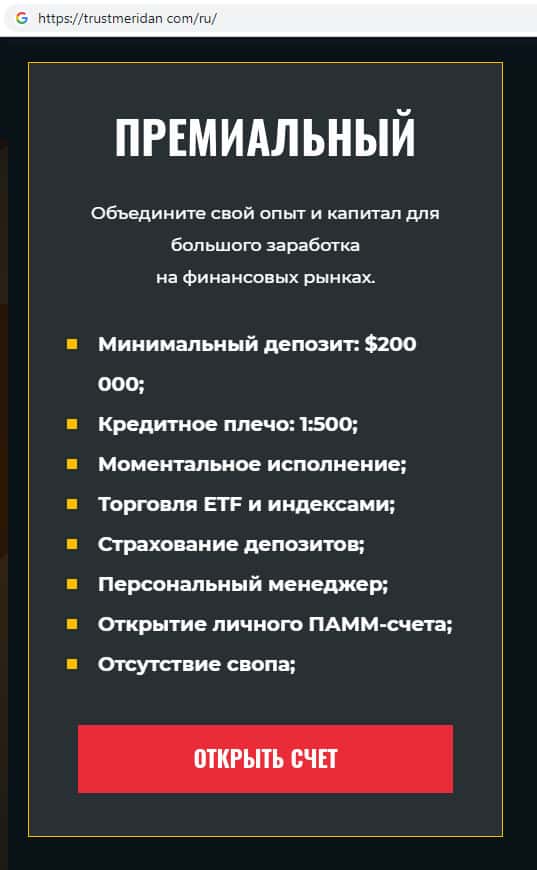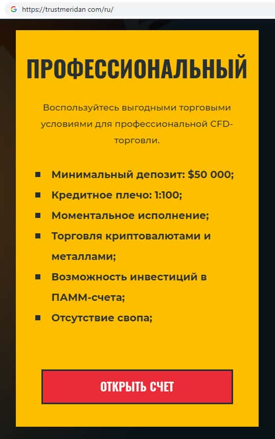 Третий тип торгового счета на сайте скам-организации TrustMeridan называется Профессиональный. Реальный форекс стартует в основном с суммы в 100000 долларов.