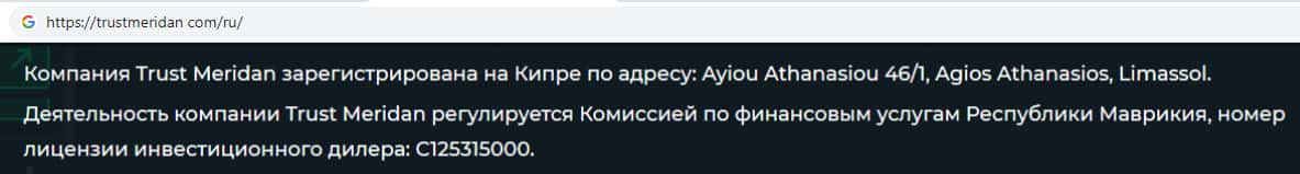 Местом регистрации Траст Меридан является оффшорное государство Маврикий, где зарегистрировано огромное количество аналогичных онлайн-лохотронов.