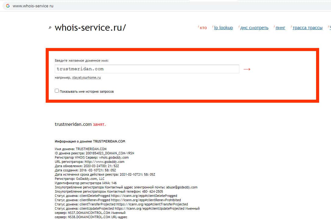 Проверка срока действия домена скам-конторы Траст Меридан