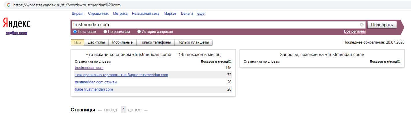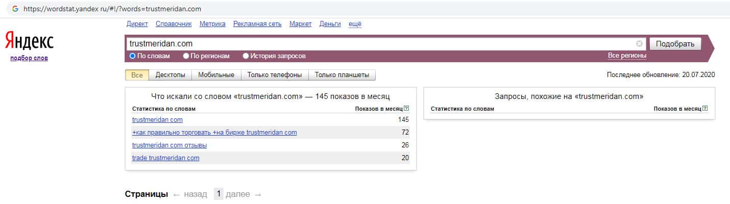 О количестве запросов по бренду англоязычного названия компании без пробела "TrustMeridan" также нет никакой информации.