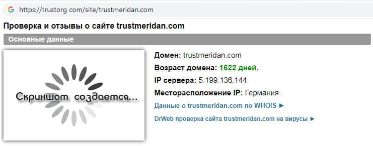 Проверка интернет-сервиса аферистов TrustMeridan на trustorg com показала, что возраст домена к моменту написания статьи составляет 1622 дня, скорее всего домен купленный.