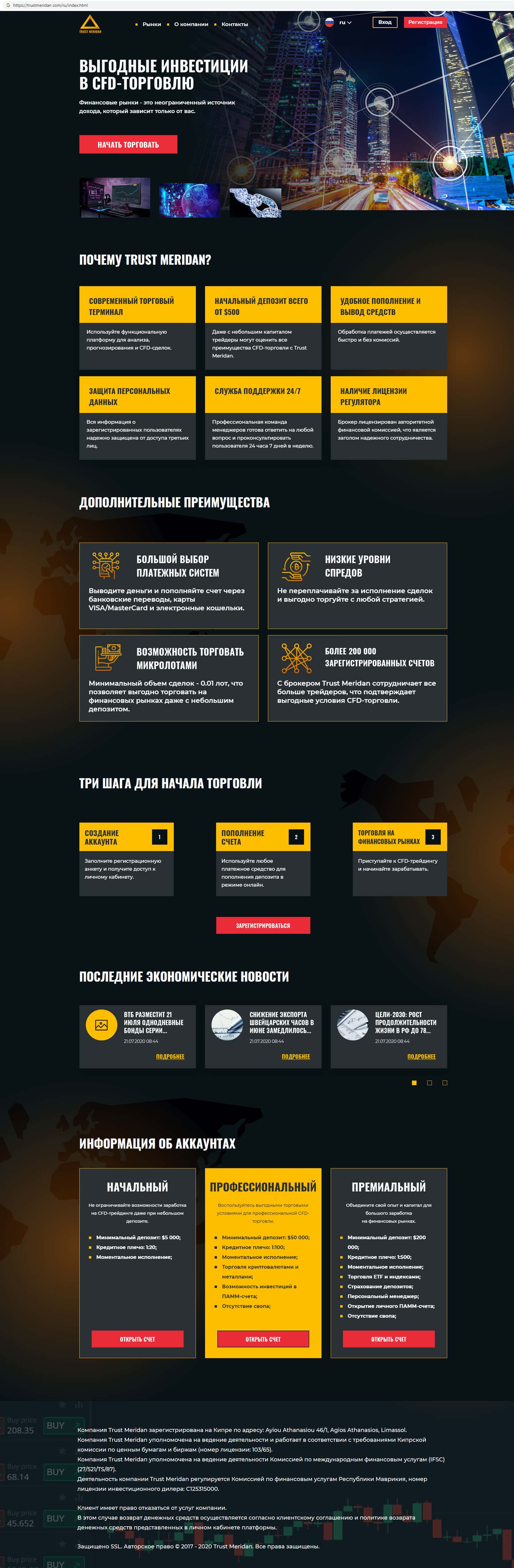 - Обзор главной страницы мошеннической организации Траст Меридан