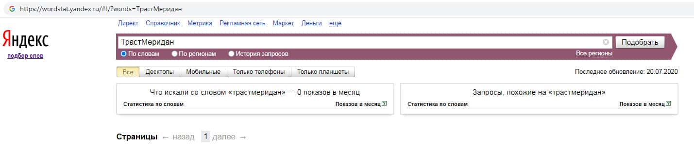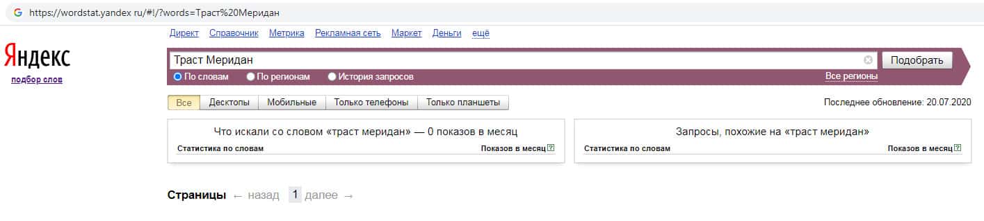 Количество запросов по бренду названия компании на русском языке с пробелом "Траст Меридан" на Яндекс Ворстарт составляет 0 показов за месяц.