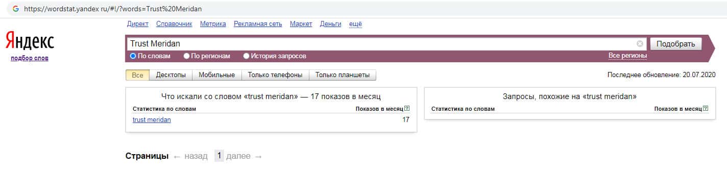 Количество запросов по бренду англоязычного названия компании с пробелом "Trust Meridan" на wordstat yandex ru составляет 17 показов за месяц.