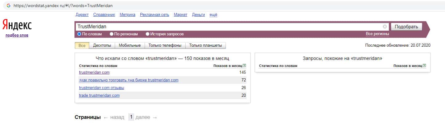 Количество брендовых запросов англоязычного названия компании без пробела "TrustMeridan" в поисковике Яндекс составляет 150 запросов за месяц.