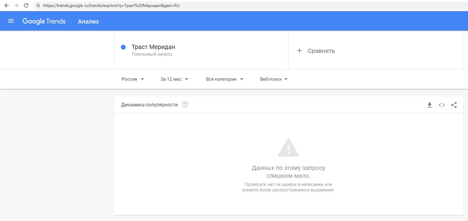 По количеству брендовых запросов названия компании на русском без пробела "ТрастМеридан" на Трендс Гугл Ру также нулевой показатель.