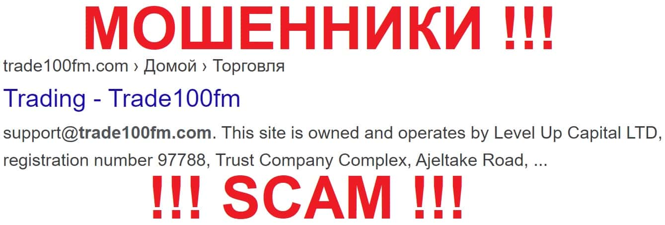 По официальным данным у якобы брокерской конторы Трейд 100 ФМ нет никакого права на предоставление финансовых услуг торговцам! Так как у лоховодов отсутствует лицензия на право деятельности, вся их лавочка работает вне правового поля! Аферисты ссылаются на еще одну оффшорную лавку Level Up Capital LTD, типа Trade100FM находятся под их управлением!