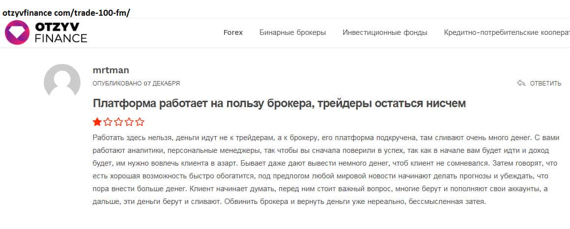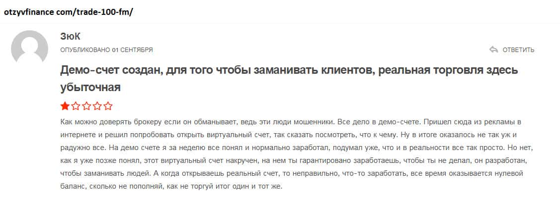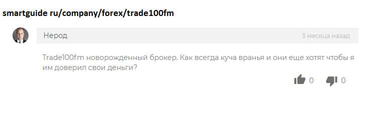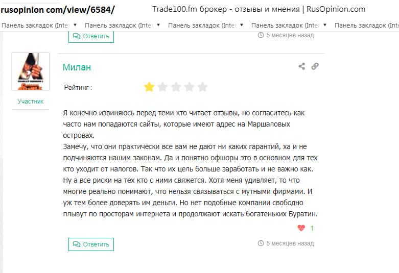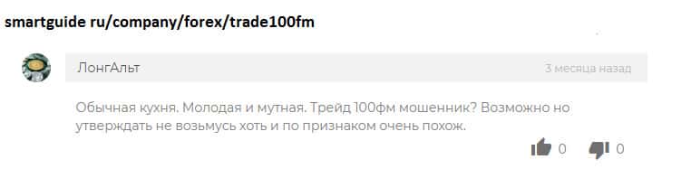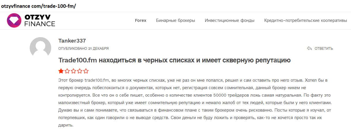 Негативные отзывы и комментарии обманутых трейдеров про шарагу Trade100FM каждый день пополняют просторы интернета! Такая черная репутация - клеймо брокерской компании! Немного еще нужно, чтобы шарага прекратила свою деятельность! Во многих черных списках аферистов, контора Trade100FM фигурирует не в первый раз! Жуликов выводят на чистую воду!
