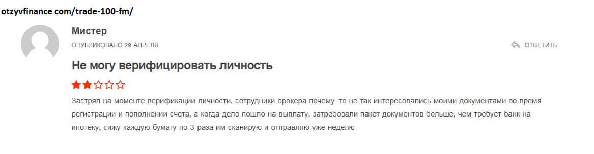 Шаражкина контора Трейд 100 ФМ делает очень хитрый маневр, когда новый трейдер проходит регистрацию, то нет строго контроля идентифицирования! Но потом, когда трейдер проходит этап вывода денег, ему необходимо пройти этап верификации личности и вот тут-то и начинается головомойка! То не те документы, то не так отсканированы - их все не устраивает!!!