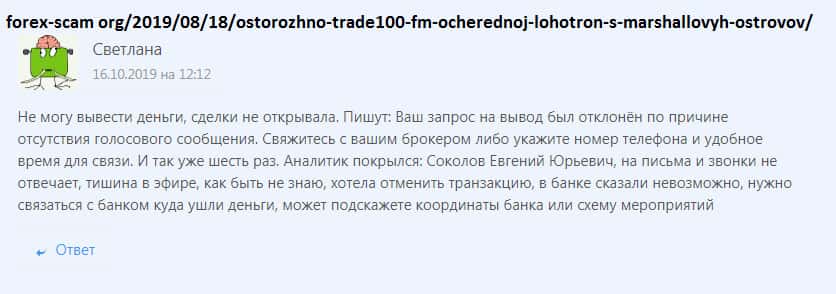 Пользовательница выложила в сети жалобу о том, что мошенники Трейд 100 ФМ не дают ей вывести деньги со счета. Якобы запрос на вывод денег был отменен по причине отсутствия голосового сообщения! Аналитик конторы Соколов Евгений до этого момента вел все сделки с трейдера, но теперь все попытки с ним связаться бесполезны! Жулик снова развели торговца!!!