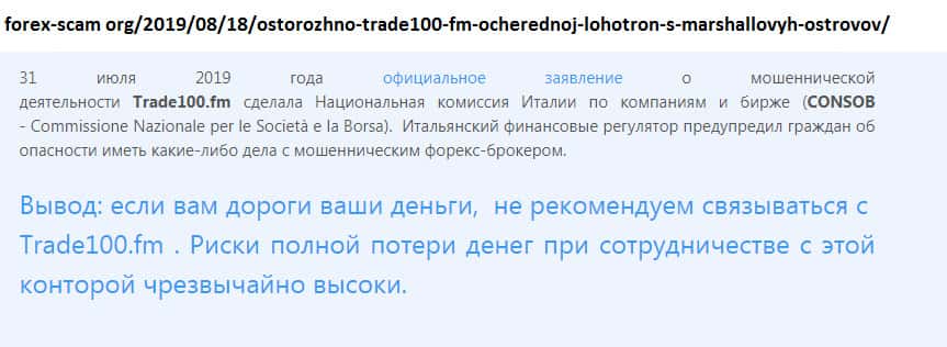 В июле 2019 года Национальная Комиссия Италии по компаниям и биржам, предупредили своих граждан о том, что Trade100FM лохотронщики и не в коем случае не надо вкладывать туда свои денежные средства! Регуляторы итальянской комиссии разоблачили мошенников и опубликовали официальные данные , что шарага Trade100FM не выводит деньги со счетов!!!
