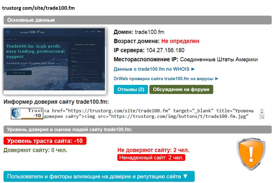 - Автоматическая проверка лохотрона Trade100FM на мошеннические действия в сети!