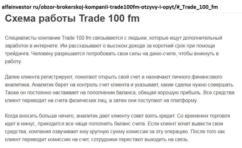 - Схема работы мошеннического псевдо-брокера Trade100FM направлена на личное обогащение жуликов!