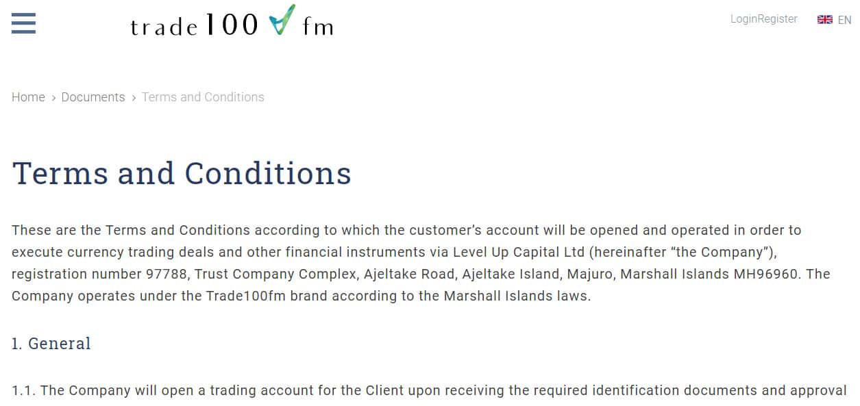 Trade100FM - контора по выманиванию денег у честных граждан! Мошенники, как это обычно происходит, зарегистрировались под оффшорной юрисдикцией, на Маршалловых островах. Поэтому обманутым трейдерам не удастся никаким образом привлечь аферистов к ответственности за мошеннические действия! Не верьте обещаниям лоховодов Trade100FM!