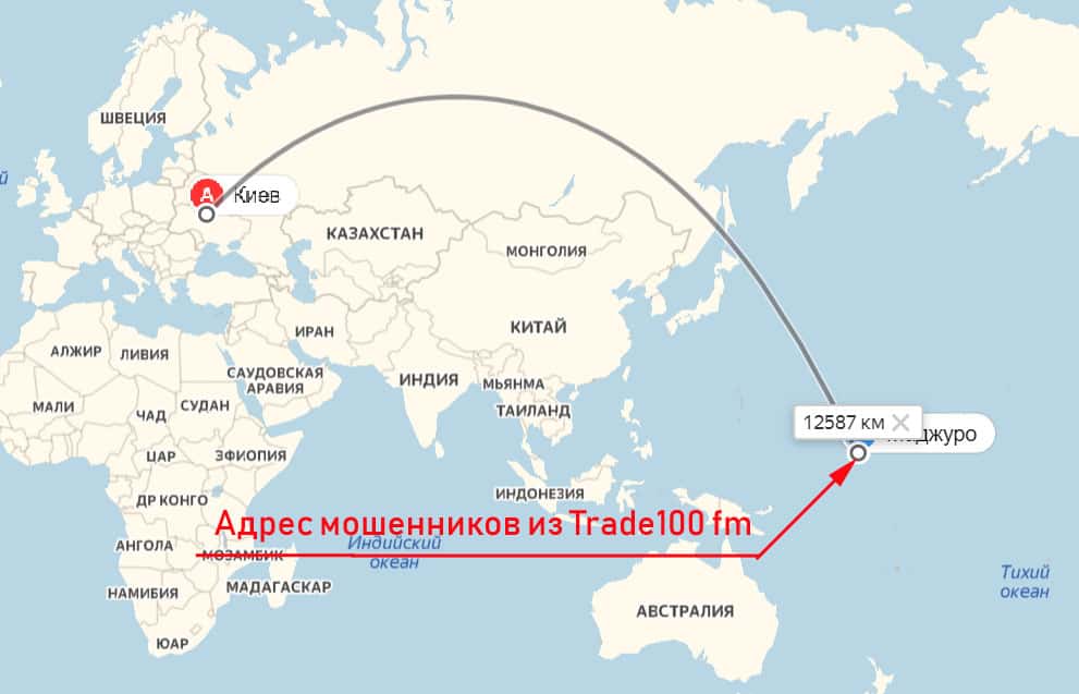 Расстояние от Киева до офиса мошенников из Trade100 fm составляет 12587 километров В том случае если бесстыжие лохотронщики Трейд 100 Вас ограбили или хотели это сделать, то в таком случае сообщите свой адрес электронной почты чуть ниже, и мы при любых обстоятельствах с Вами выйдем на контакт по электронке.