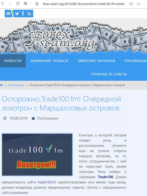 Предупреждение о мошенниках Trade100 fm на сайте forex-scam orgТрейд100 - оффшорный брокер, ваши деньги в опасности