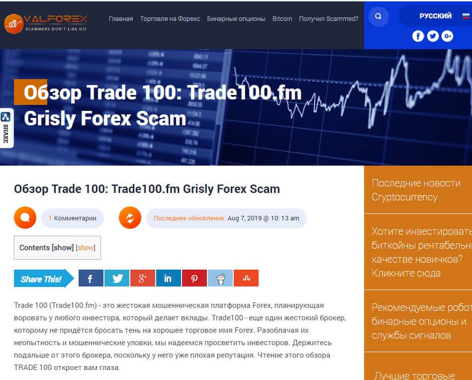 Портал scamonline net выносит неутешительный вердикт сервису Трейд100 фмПортал valforex раскрывает жестокое мошенничество Трейд100 фм
