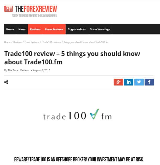 Обзорная статья о Трейд100 фм, размещенная на портале theforexreview, предупреждает пользователей Интернет о мошеннической деятельности компании. Авторы сообщают, что правительство Маршаловых островов не имеет регулятора брокерской деятельности вообще, что получить уже переведенные на счет компании средства обратно нереально.