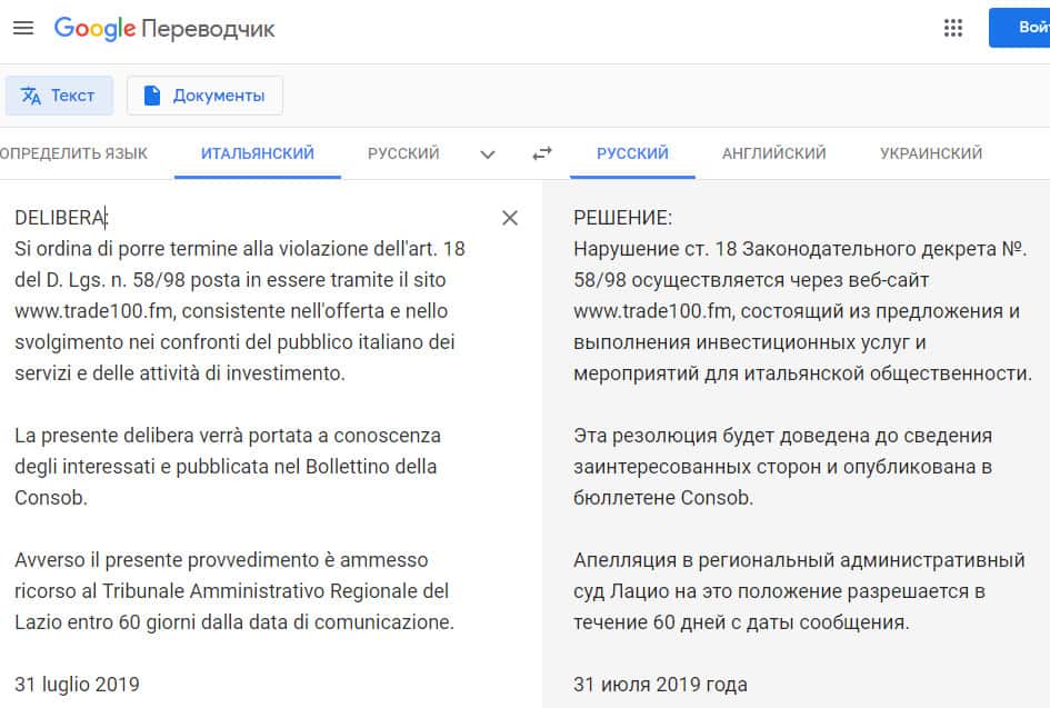 Google-перевод решения Национальной комиссии Италии по брокеру Trade100 fmПротиворечивое отсутствие отзывов о деятельности Трейд100 фм в сети Интернет