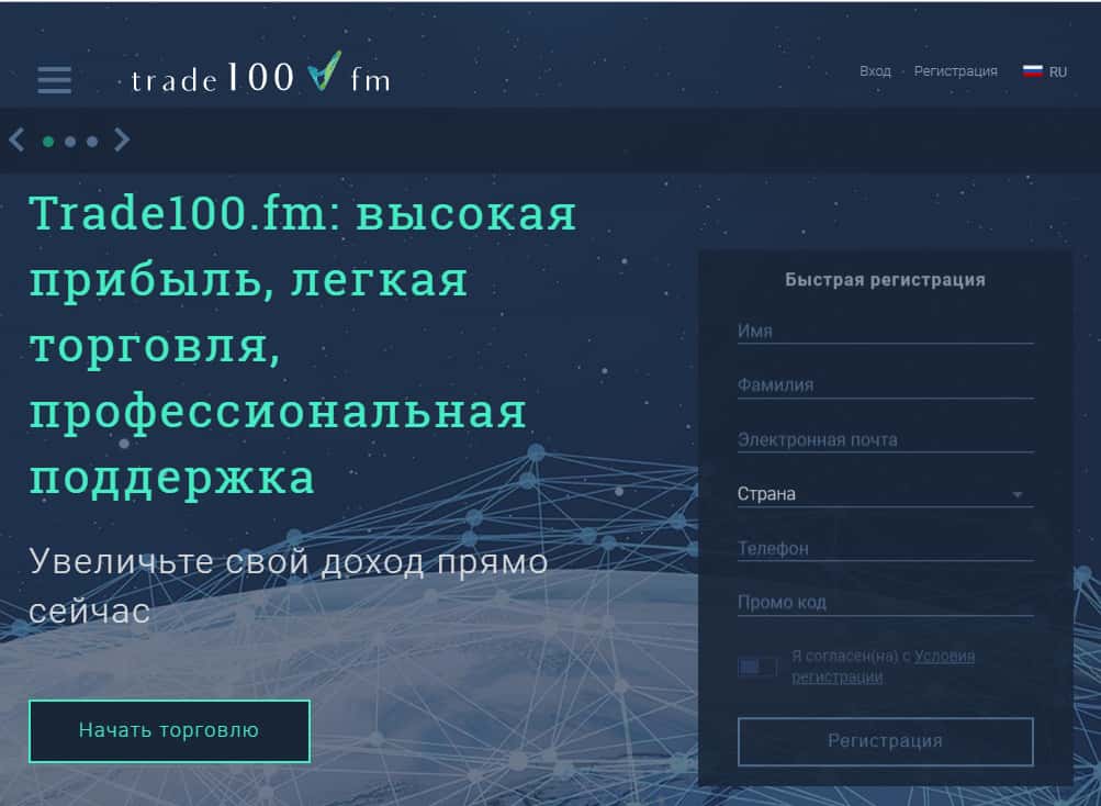 Trade 100 fm - контора жуликов и мошенников. Они скрываются за маской честного брокера и заманивают наивных пользователей интернета обещаниями легких заработков и сладкой жизни. Однако, правда жизни говорит об обратном.