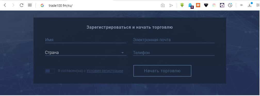 Нет времени на размышления, если зашёл на сайт Трейд100 фм, значит нужно торговать, чего зря тратить время. Вероятно таково мнение создателей сайта. Ведь сразу, вместе с просмотром рекламных заявлений пользователям предлагают пройти быструю регистрацию с подписанием клиентского соглашения.