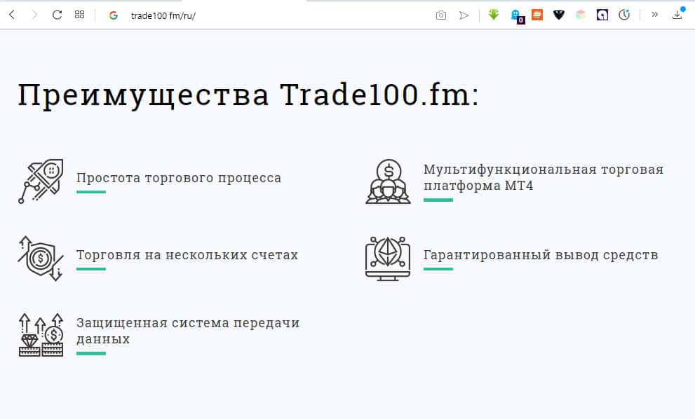 Для тех посетителей сайта, кто не стал сразу же регистрироваться, предлагается ознакомиться со списком преимуществ брокера Трейд100 фм. Это не займет много времени, ведь преимуществ всего пять: простота торговли, торговля на нескольких счетах, защищенная передача данных, торговая платформа МТ4 и гарантированный вывод средств.
