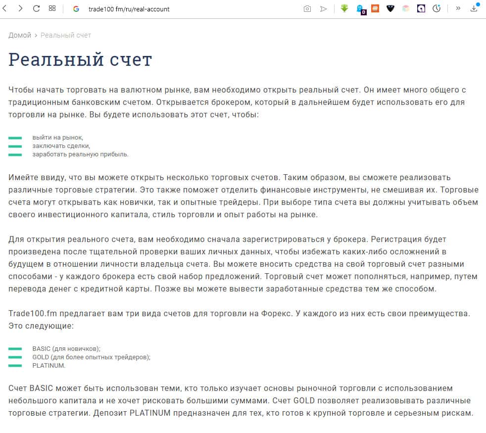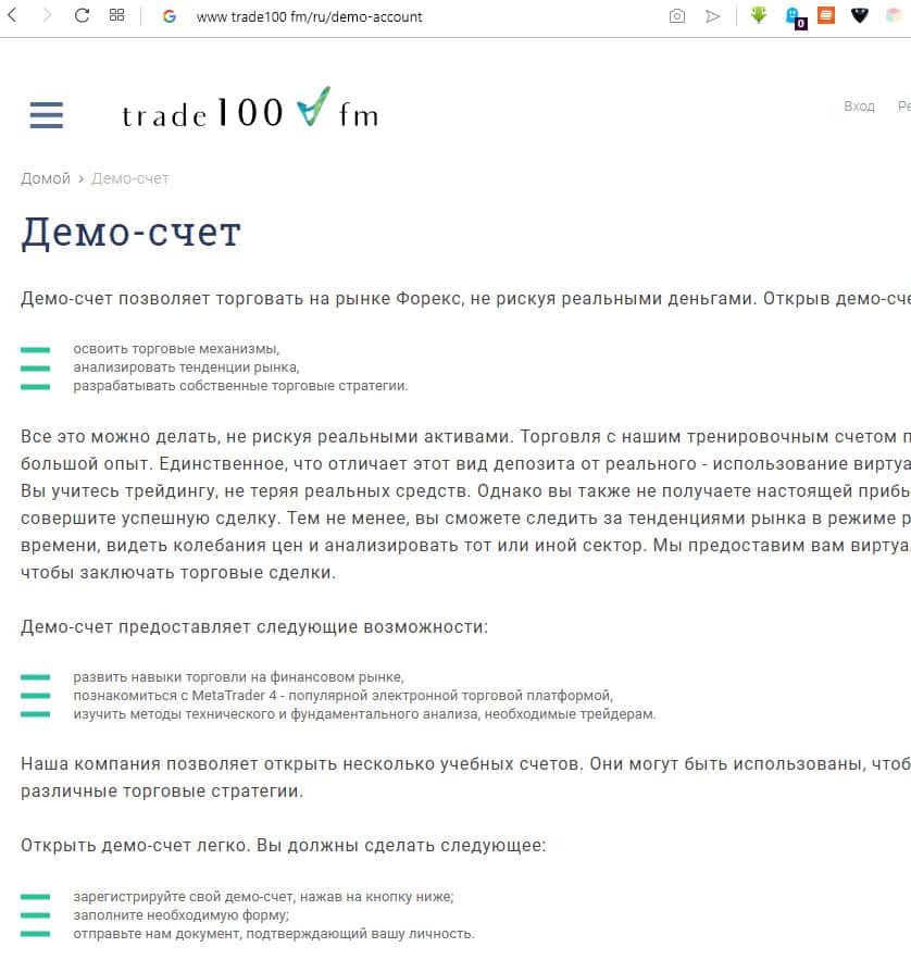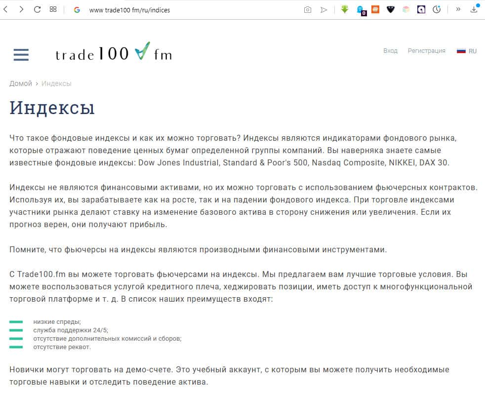 Эфемерные преимущества Трейд100 фм над остальными лжеброкерами Но, как известно, время - деньги. Время не ждёт, а неумолимо идет вперёд. Поэтому вкратце познакомив с преимуществами брокера Трейд100 фм, пользователю снова предлагают, отбросив сомнения, зарегистрироваться, и приняв пользовательское соглашение, поплнить ряды наивных лохов.