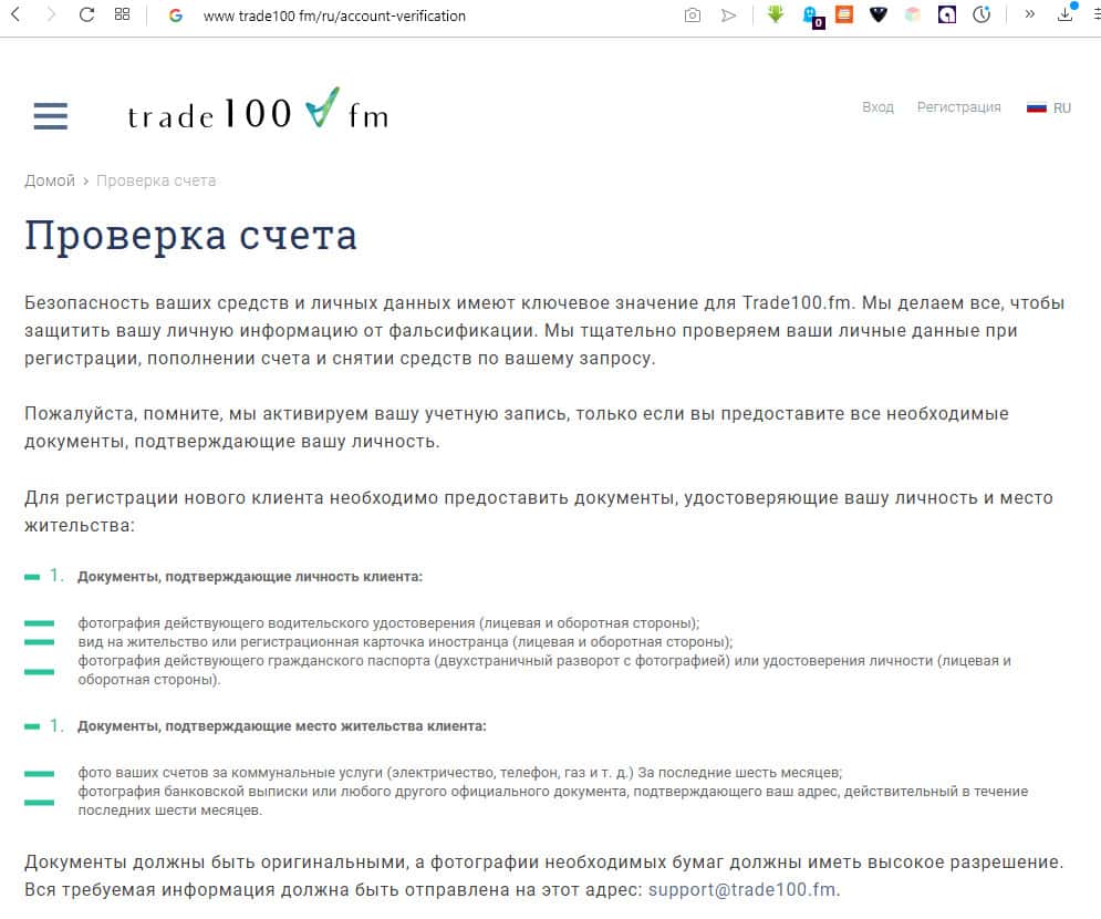 Дальнейший процесс подготовки к торговле на Трейд100 фм выглядит следующим образом: клиент должен предоставить копии своих персональных и банковских данных в высоком разрешении. Что остается после этого ожидать, долгожданную возможность заработать на торгах или стук в дверь коллекторов и жизнь на улице?