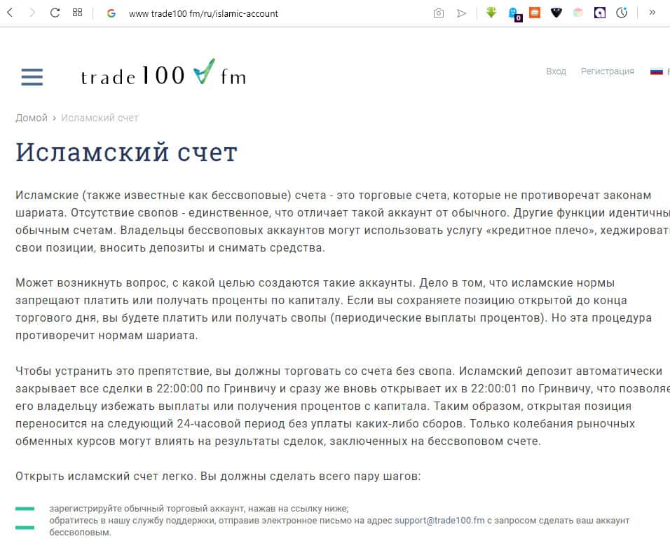 "Реальные" счета на торговой площадке Трейд100 фм Также пользователю предлагается использовать так называемый "исламский" счет. Для его открытия требуется пройти обычную регистрацию, открыть счет и обратиться с просьбой на открытие исламского счета в службу поддержки посредством электронной почты. Почему нельзя просто в регистрационной форме счета поставить чекбокс? Снова вопрос!